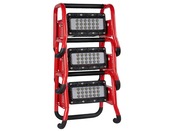 産業用プロ向け、ポータブルな10,000ルーメンのコードレス投光器。18個のLEDと広範囲に光を届ける反射鏡がワイドで均一な照射を実現します。ライトヘッドは360度自在に回転。明るさは5段階に調整可能で、内臓リチウムイオンバッテリーによる点灯時間を有効に引き出せます。また、バッテリー残量による点灯可能な時間が表示されます。付属のACアダプターやDC12Vシガレットライターコードにより連続点灯することも可能です。「ポータブルシーンライトII」は3台まで積み重ねて使用することができますので、調光して点灯時間を延ばしても、台数を増やすことにより明るさを増すことが出来ます。