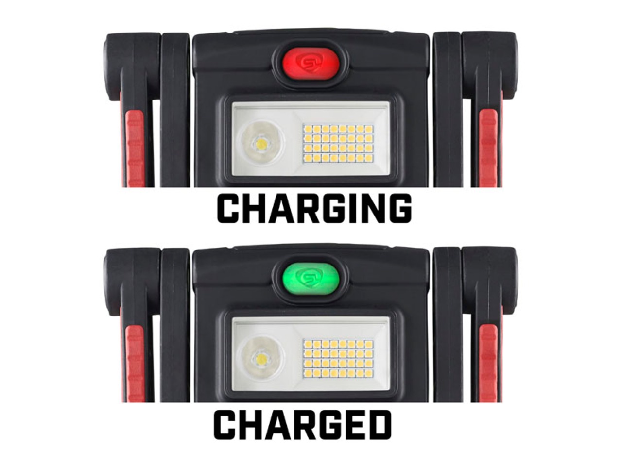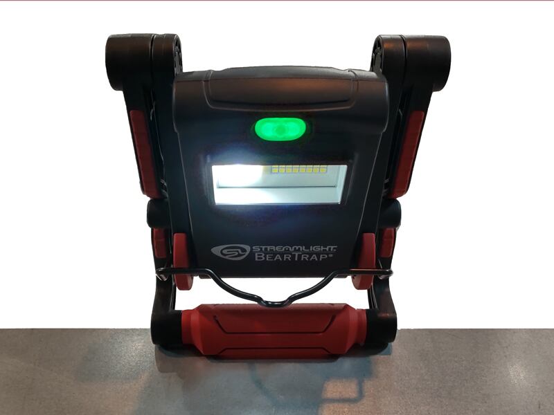 非常に堅牢な作りのプロ用多目的ポータブル投光器「ベアートラップ」。大型のクランプと強力マグネットにより固定して使用できるほか、270度回転するヘッドにより平置きでも希望の方向へ投光できます。スポットLEDと散光LEDが独立して装備されていて、それぞれに「低」、「中」、「高」の3段階調光となっています。スイッチを押すたびに「低」→「中」→「高」と切り替わり、長押しをすることにより「散光LED」と「スポットLED」を切り替えます。またスイッチに内蔵されたカラーLEDによりバッテリーの残量を表示します。「低」でも充分に明るく、内蔵バッテリーで12時間以上点灯することができます。バッテリーの充電時間は5時間半で充電しながらでも点灯することが可能です。非常に丈夫な樹脂素材を使用していて、強力マグネット付きのハンドルにはクッション加工がされていますので自動車のボディー等を傷つけません。レンズは耐薬品性の素材を採用していて、自動車に使用されるほぼ全ての油脂類に対して耐久性があります。