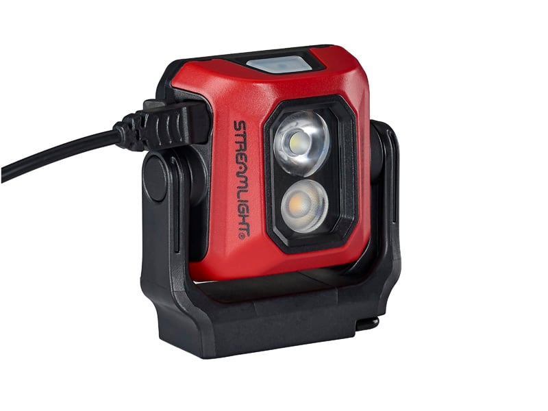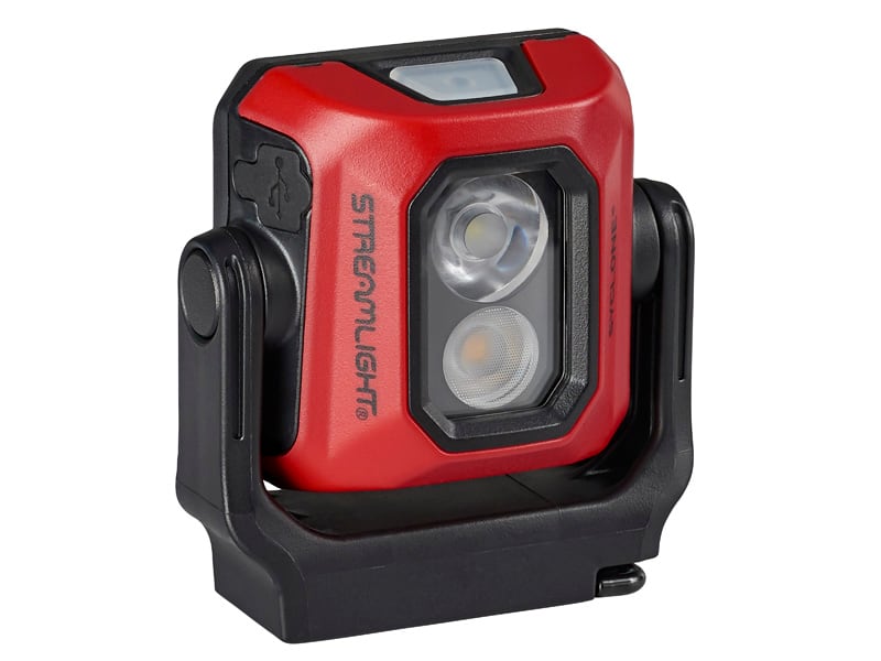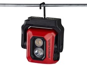 スポットLEDにはクールホワイトで明るい光。散光LEDには色味が正しく再現される高演色LED (90CRI LED) を装備。各LEDは共に3段階調光で、用途の異なる両LEDを同時に点灯することは出来ません。スイッチ操作は押すたびに「高」、「中」、「低」と変わり、長押しでLEDを切り替えます。2秒以上スイッチ操作が無いと、どの明るさで点灯していても次のスイッチ操作で消灯します。充電は本体のゴムカバーを開けてUSBコードを差し込み行います。スイッチ自体がバッテリー残量と充電状態をカラー表示します。U字型のマウントに取り付けられたヘッドは360°回転する構造となっていて、マウントのマグネットや収納されているフック、或いは直接床に置いて多様な使い方が可能です。2mの落下テストにも合格した剛健なコンパクトワークライトです。