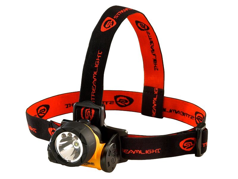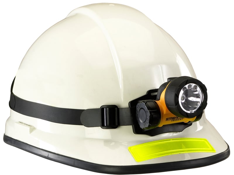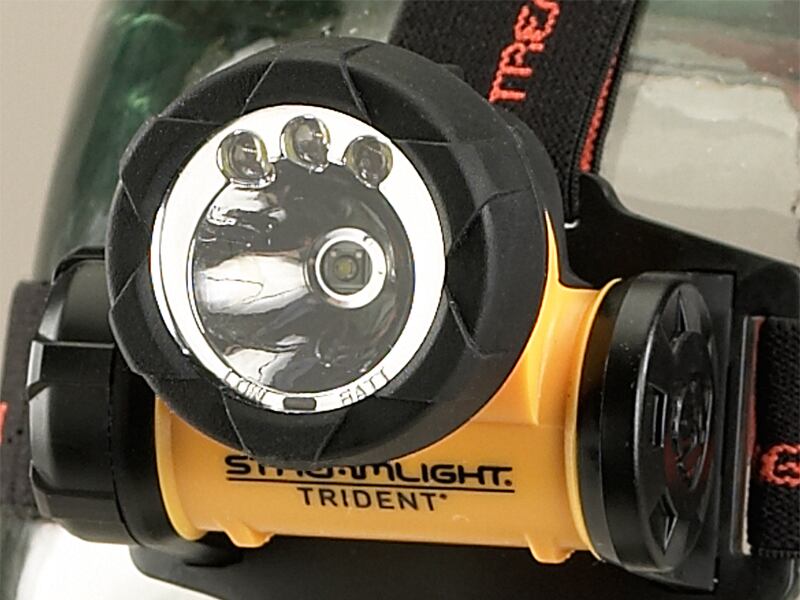 米国の防爆認証を取得した高性能のLEDヘッドライト「トライデント(LED)」。先端のC4 LED技術搭載により、従来の電球モデルから大幅にパワーアップ。点灯モードは「C4スーパーLED1灯」、「高輝度LED3灯」、「高輝度LED1灯」の3パターンを用途に応じて使い分けることができます。「高輝度LED3灯」の点灯では10時間の連続点灯が可能です。また、電池切れが近くなると反射板下縁にある赤色LEDが点滅してお知らせいたます。 ライトヘッドは上下に90度の角度調整が可能。ヘルメット用のゴムストラップも付属していますので、ヘルメットにもガイド無しで安定して固定することができます。2mの落下試験にも合格。雨の中での使用にも安心の防敵構造となっています。